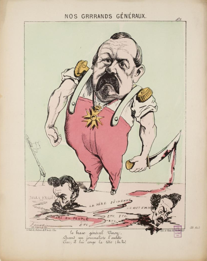 Le brave général Vinoy! quand un journaliste l’embête — crac, il lui coupe la tête. C’est une caricature de Faustin, qui a représenté les têtes des journalistes Jules Vallès (à gauche) et Henri Rochefort (à droite), dont les journaux Le Cri du peuple et Le Mot d’ordre ont été interdits. J’ai trouvé cette image au musée Carnavalet.