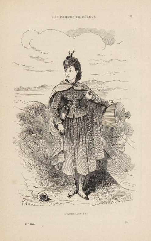 L’ambulancière de l’image de couverture ne venait peut-être pas du dixième arrondissement, mais c’était bien une femme! Le dessin est dû à Paul Hadol et vient du livre sur les Femmes de France, via le musée Carnavalet.