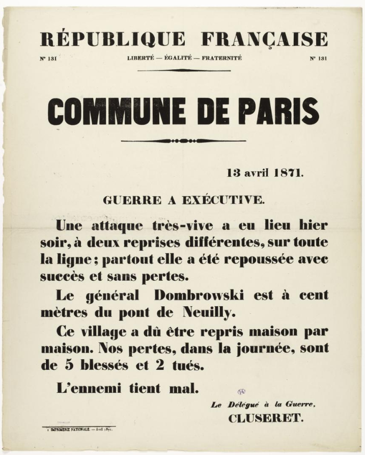 Ce matin, le Journal officiel annonce aussi des élections complémentaires pour le 16, la décision prise hier par la Commune de démolir la colonne Vendôme, un autre décret signé de Jourde, Varlin et Cluseret, sur la solde des officiers de la garde nationale, incluant les généraux (qui avaient pourtant été supprimés (??), voir notre article du 7 avril), la réouverture prochaine des musées (ce sera pour après-demain), le compte rendu de mandat des élus à la Commune du troisième arrondissement, et bien d’autres choses encore…