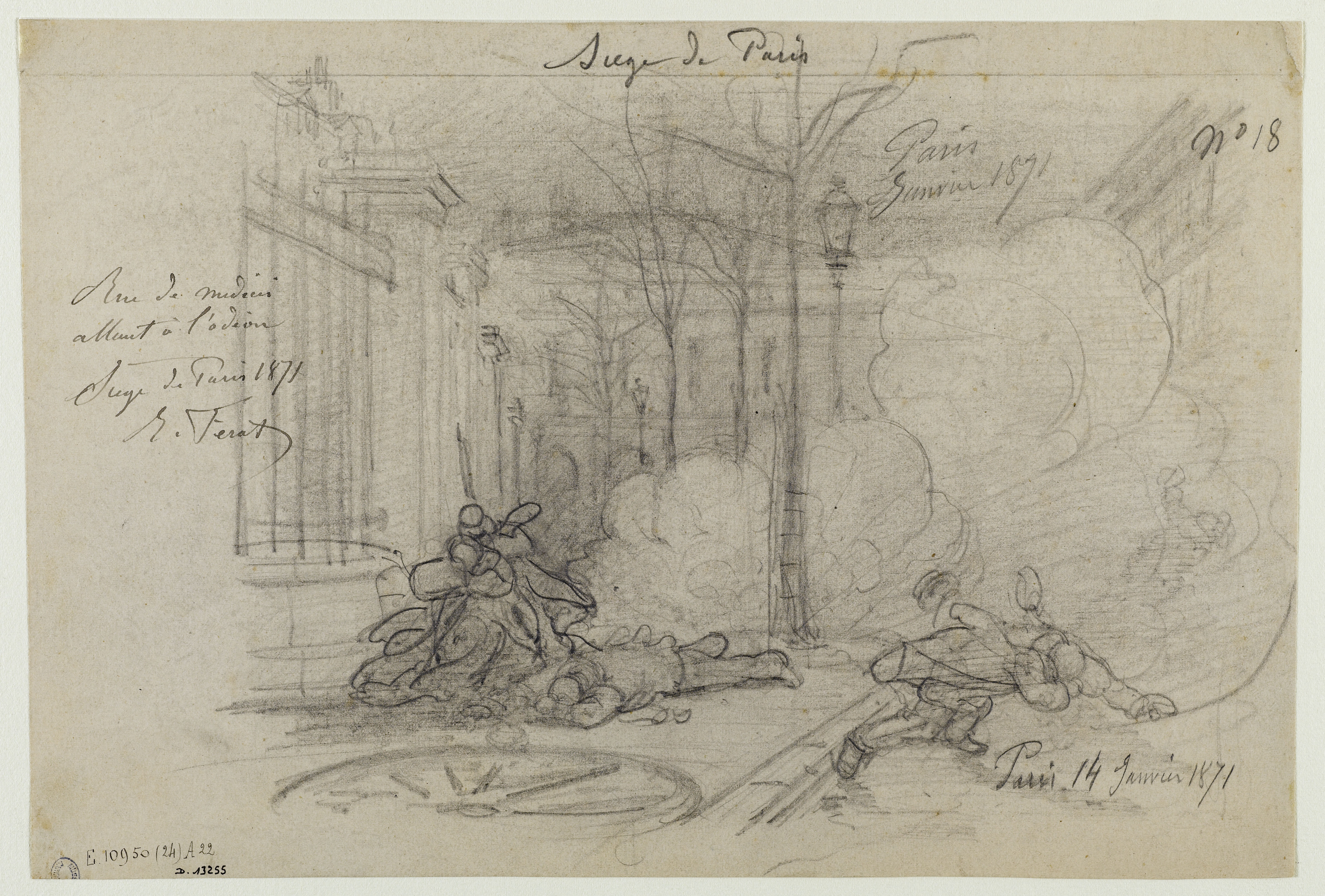 Comme vous le voyez (vous pouvez agrandir l’image en cliquant dessus), le dessinateur a titré « Siège de Paris ». Il y a un « n°18 » qui laisse penser qu’il a fait d’autres dessins sous ce titre général. Il a indiqué, à gauche, le lieu, « Rue Médicis en allant à l’Odéon », a rajouté « Siège de Paris, 1871 » et a signé. En bas à droite, il a précisé la date « 14 janvier 1871 ».
