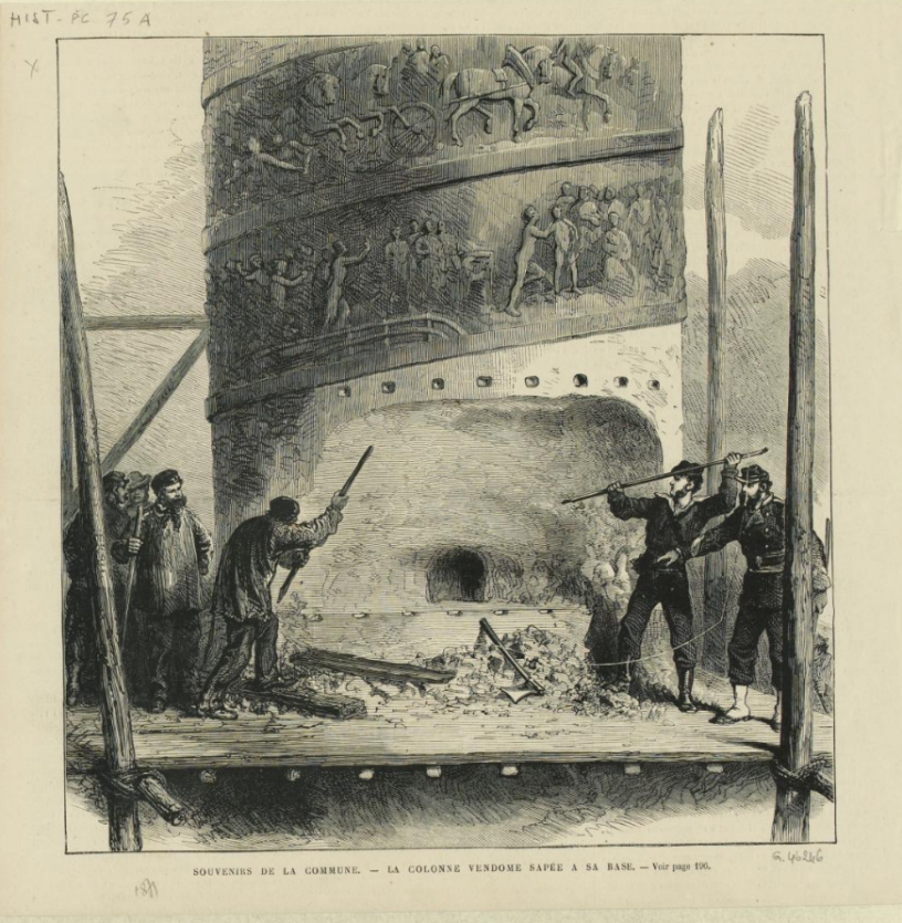 La rime est riche, n’est-ce pas? Et voici la dernière fête de la Commune. L’idée d’abattre la colonne Vendôme, colossal symbole de la gloire militaire, datait du 4 septembre. Le décret a été pris le 12 avril.