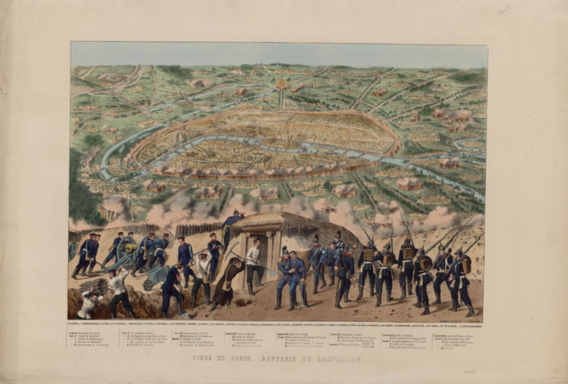 Paris enfermé dans ses fortifications vu de la batterie (et pas bataille) de Châtillon (ici aux mains des Prussiens me semble-t-il) en couverture de cet article est au musée Carnavalet.