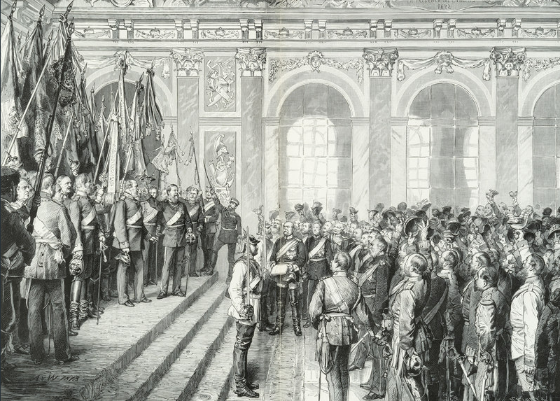C’est à Versailles, parce qu’ils sont là, parce que c’est là que les a menés leur guerre conquérante, et que donc c’est plus pratique, mais surtout, c’est symbolique, leur victoire scelle leur unité — et humilie les Français. Peut-être auraient-ils préféré les Tuileries, mais ils n’ont pas conquis Paris. Et, de toute façon, les Tuileries, ils connaissent, ils y ont été invités, c’était peu après la Deutscher Krieg, à l’occasion de l’Exposition universelle, en 1867.