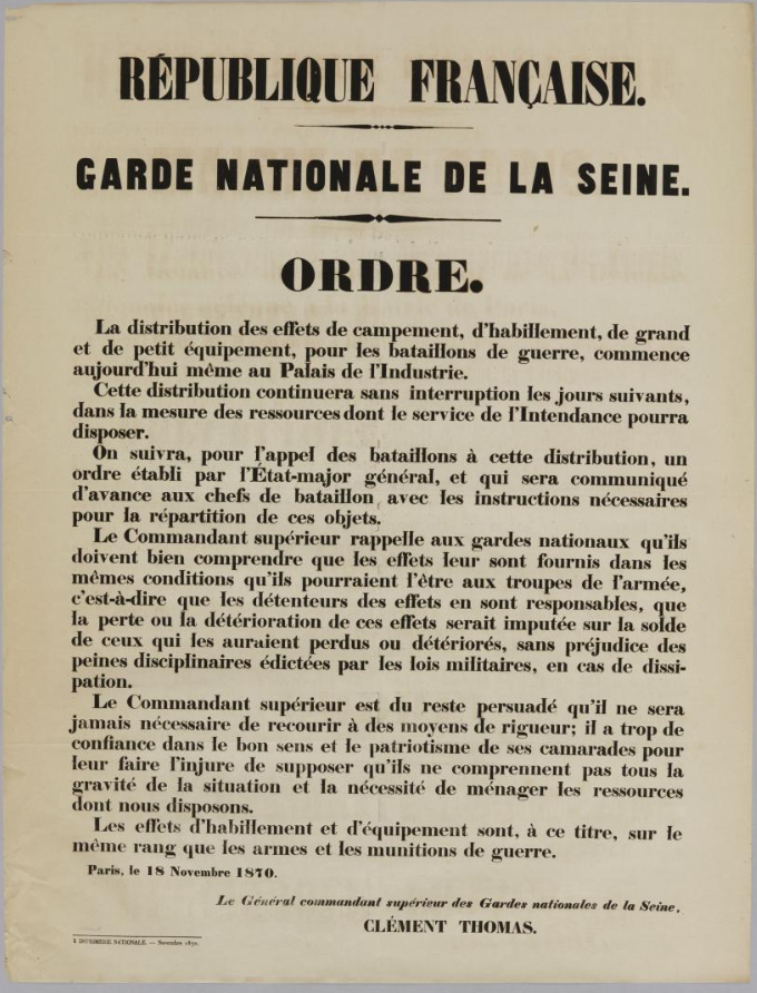 La distribution des effets d’équipement à la garde nationale, annoncée par Clément Thomas dans l’affiche de couverture (venant du musée Carnavalet), ne semble pas une fausse nouvelle!