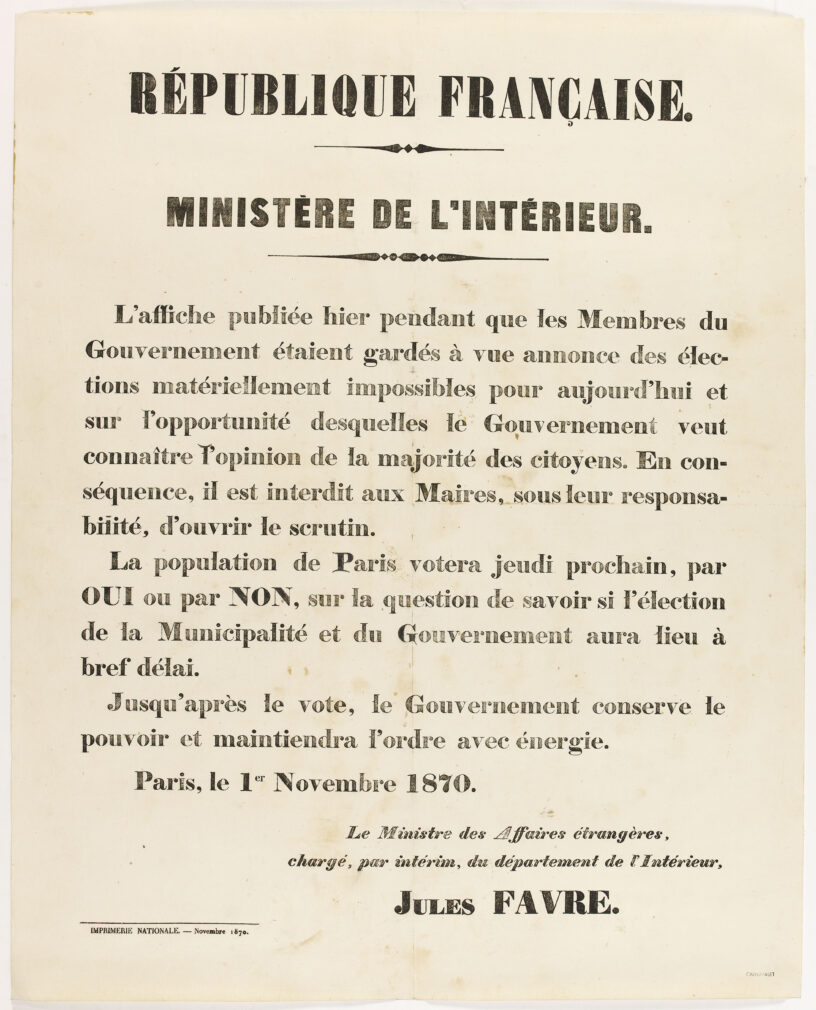 Le 1er novembre, sur l’affiche de Dorian, Schœlcher, Étienne Arago annonçant les élections municipales, une autre affiche de Jules Favre était collée, annonçant que ces élections étaient ajournées […]. C’était manquer à la parole donnée, revenir tout au moins sur l’une des décisions, celle qui avait été prise, non pas, comme le disait Jules Favre, pendant que les membres du gouvernement étaient gardés à vue, mais avant l’envahissement de l’Hôtel de Ville, par délibération des vingt maires acceptée du gouvernement.