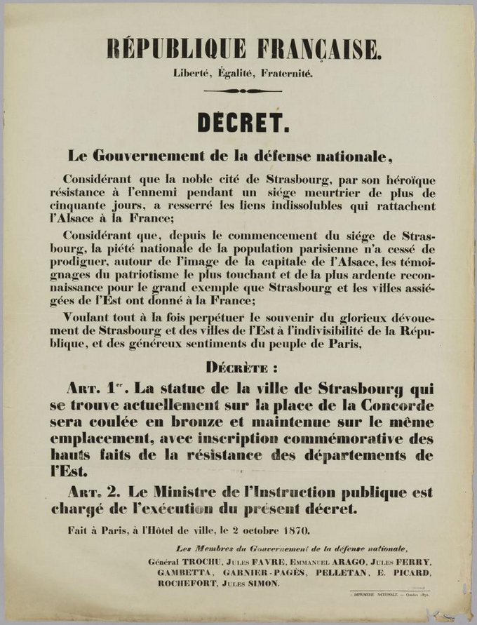 L’affiche utilisée en couverture — et datée d’aujourd’hui 2 octobre, quelques jours après la capitulation de Strasbourg — est au musée Carnavalet. Il est probable qu’on a trouvé que le bronze serait mieux utilisé à d’autres fins… en tout cas, la statue de Strasbourg est toujours en pierre, comme celles des sept autres villes de France présentes sur la place de la Concorde à Paris.