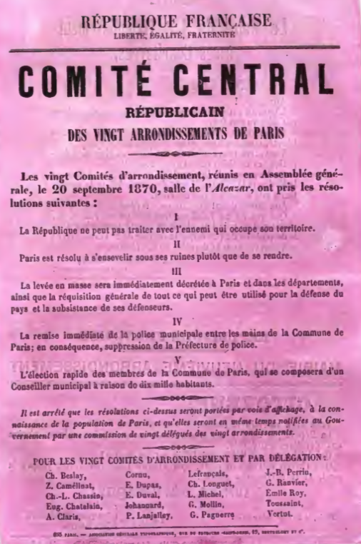 Il est arrêté que les résolutions ci-dessus seront portées, par voie d’affichage, à la connaissance de la population de Paris, et qu’elles seront en même temps notifiées au gouvernement provisoire par une commission composée de vingt délégués choisis dans chacun des arrondissements.