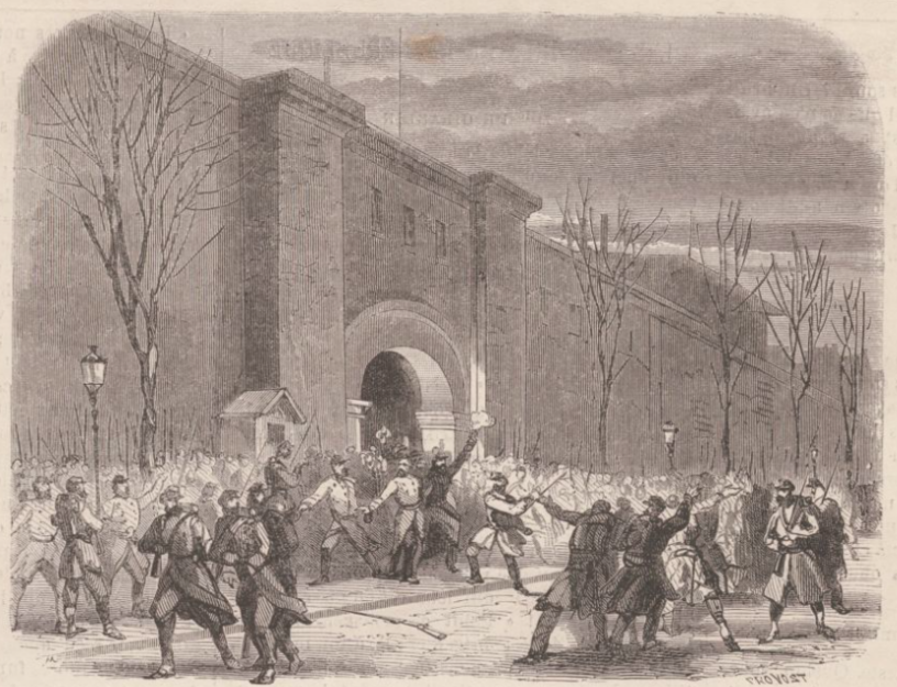 Ils doivent descendre cette nuit. Ils pensent même nous enlever ainsi que Flourens dont on a fini par s’emparer [voir notre article du 7 décembre], et qui se trouve, avec le citoyen Bauer [Bauër], à Mazas. Ils nous recommandent de nous tenir prêts à tout événement.