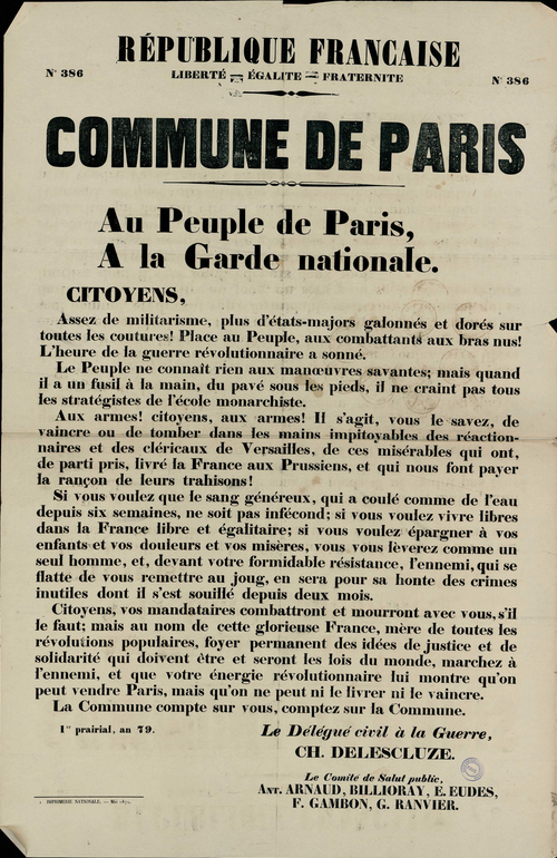 Remarquez que cette proclamation du Comité de Salut public ne contient pas explicitement le fait que l’armée versaillaise est entrée dans Paris — mais elle l’est (voir notre article d’hier). Remarquez aussi, comme dit Lissagaray, qu’elle « flétrit » la discipline — alors même que l’absence de discipline était le gros point faible de la garde nationale.