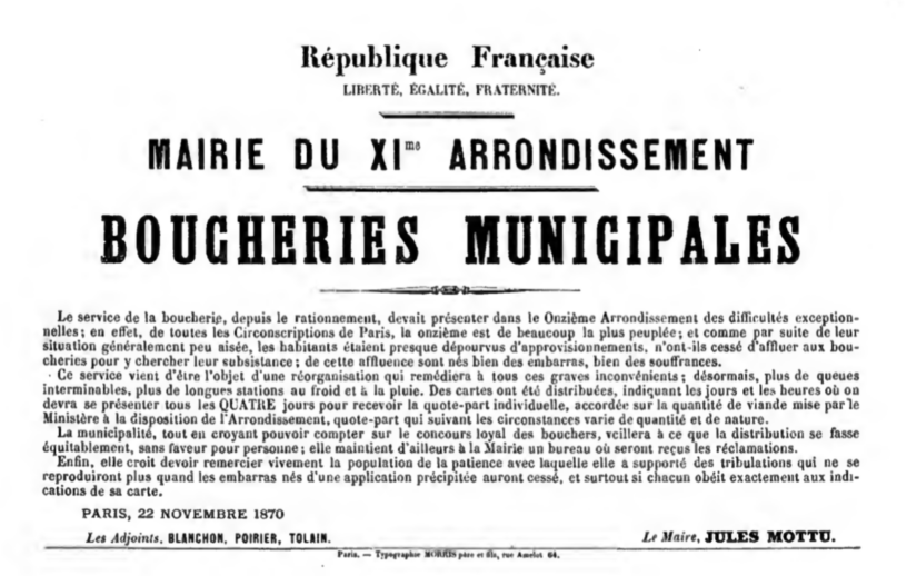 Le citoyen Mottu a eu fort à faire ce 22 novembre. Outre accueillir le prisonnier de Rigault, il devait se préoccuper… de la nourriture de ses administrés. L’affiche qui sert de couverture à cet article vient d’un recueil de murailles politiques et je n’ai malheureusement pas trouvé une image de meilleure qualité.