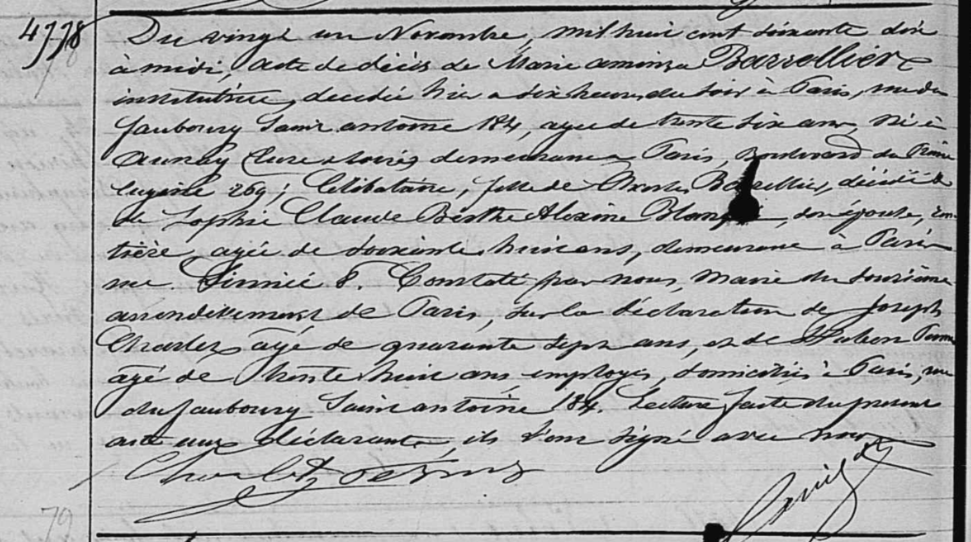 Il n’y a donc « plus qu’à » consulter les tables décennales de l’état civil de Paris. Comme la BnF, les archives de Paris sont fermées, mais les registres sont en ligne. Je regarde les vingt registres des vingt arrondissements. Pas de Marie Barellier. Mon désappointement doit faire sourire Maxime Jourdan qui, fort de mon échec, trouve dans les mêmes registres une Marie Barrellier. Dont il m’envoie l’acte de décès. Que voici.
