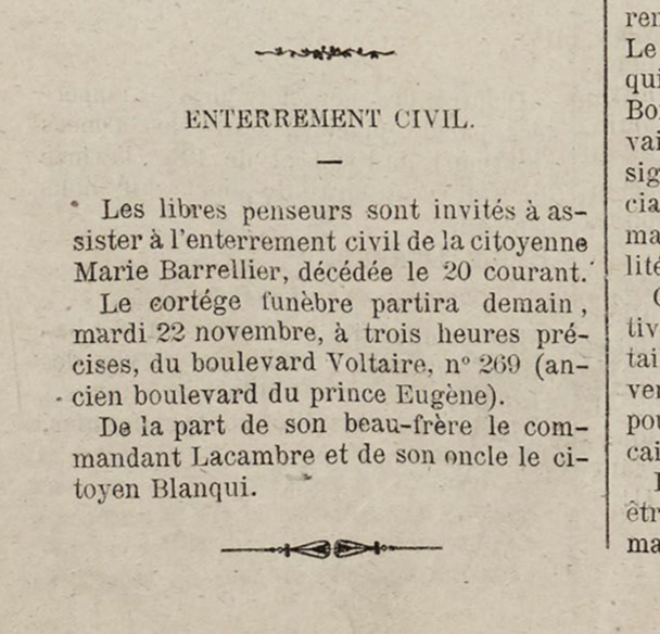 En ces derniers jours de novembre, le deuil privé s’ajoute au deuil public, par la mort d’une nièce de Blanqui, Marie Barellier.