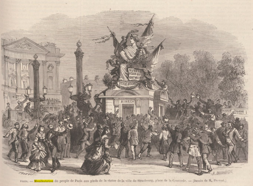 La statue de Strasbourg place de la Concorde a été le lieu d’innombrables manifestations de 1870 à 1918. L’image de couverture représente une des premières, avant même celles dont il est question dans cet article. Elle est parue dans Le Monde illustré daté du 10 septembre 1870.
