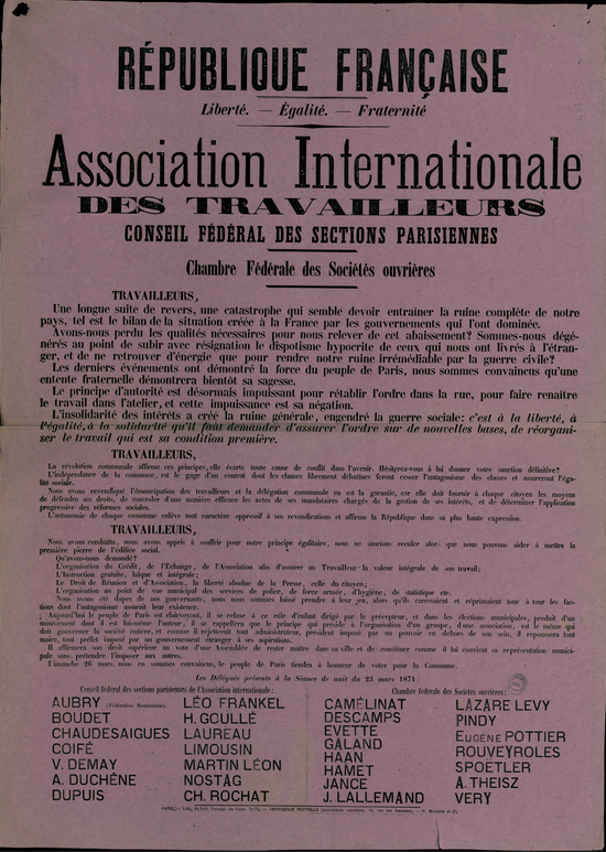 Camélinat, Descamps, Evette, Galand, Haan, Hamet, Jance, J. Lallemand, Lazare Levy, Pindy, Eugène Pottier, Rouveyroles, Spoëtler, A. Theisz, Very
