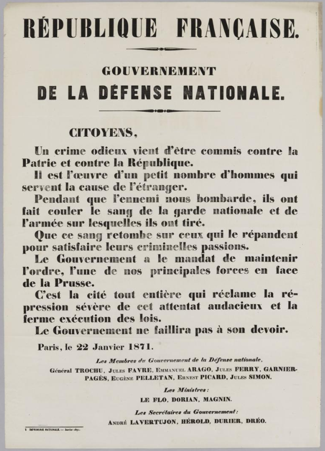 Une proclamation indignée dénonça les insurgés comme « les partisans de l’étranger », seule ressource des hommes du 4 Septembre dans leurs crises honteuses. Par là seulement, ils furent Jacobins. Qui servit l’étranger, du Gouvernement toujours prêt à traiter, ou des Parisiens toujours acharnés pour la résistance ? L’histoire dira qu’à Metz une armée immense, encadrée, instruite, de vieux soldats, se laissa livrer sans qu’un maréchal, un chef de corps, se levât pour la sauver de Bazaine, tandis que les Parisiens sans guides, sans organisation, devant deux cent quarante mille soldats et mobiles acquis à la paix, firent reculer de trois mois la capitulation et la vengèrent de leur sang.