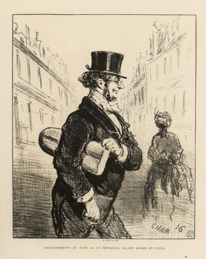 L’estampe de Cham, un monsieur qui va dîner en ville et qui amène son pain, effet du rationnement, date de… dans quelques semaines. Mais le monsieur est peut-être un académicien des sciences, qui sait? Cette estampe est au musée Carnavalet, et je l’ai copiée ici.