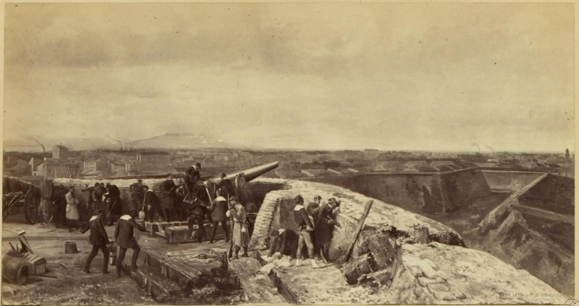 La Joséphine, sur son bastion 40, d’où l’on voit le Mont-Valérien, est une sorte de symbole du siège de Paris (avec le pain Ferry — dont nous parlerons le 29 décembre). Elle fait, par exemple, la couverture du petit livre de Georges Duveau que j’ai déjà cité plusieurs fois. L’image que j’ai mise ici en couverture est justement celle dont il a utilisé un détail. Elle vient du musée Carnavalet, précisément là, où elle est qualifiée à la fois de « peinture de Guiaud et Decaen » et de photographie, et fait clairement partie de la même série que l’image utilisée dans notre article du 17 novembre. On y voit bien le Mont-Valérien et les marins qui « servent » le canon.