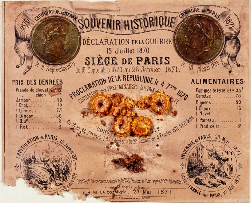 On parle beaucoup de nourriture, pendant le siège de Paris, et c’est bien normal, puisqu’il y en a peu — en tout cas si peu disponible pour la population… Nous avons vu les scientifiques s’inquiéter du pain (article du 26 septembre) et de la viande (article du 17 octobre), les bourgeois en parler chez Brébant (le 11 décembre), Émile Dereux chanter son beefsteak (le 15 novembre), les femmes de Belleville et Victorine s’inquiéter (le 19 et le 21 novembre), il y aura des éléphants (les 31 décembre et 1er janvier), un « lapin » le 2 janvier. Même La Patrie en danger nous a donné une recette de soupe (le 8 décembre), nous avons cité et citerons encore La cuisinière assiégée.