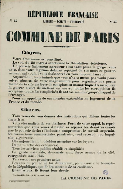 Une commission a été nommée pour la rédaction d’une proclamation (Grousset, Vaillant, Tridon et Protot). Et une proclamation a été rédigée — il s’agit du texte de l’affiche que j’ai utilisée en couverture (et que j’ai trouvée à La Contemporaine). Vous pouvez cliquer sur l’image ci-dessous pour l’agrandir et la lire.