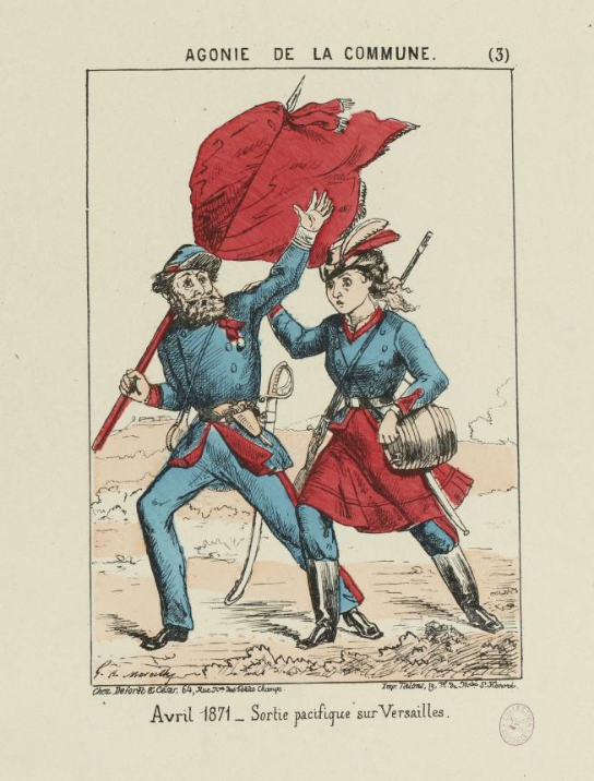 Le 3 avril, c’est le départ de la « sortie torrentielle » — sur l’image de couverture (de G. de Marcilly) qui se trouve au musée Carnavalet, elle est « pacifique ». Elle pouvait être l’un et l’autre, les soldats qui, après tout, sont gens du peuple, allaient mettre crosse en l’air, et on ferait la fête à Versailles, que le gouvernement avait fui… Souvenez-vous, Émile Duval donnait rendez-vous au délégué au Journal officiel pour dîner à Versailles…