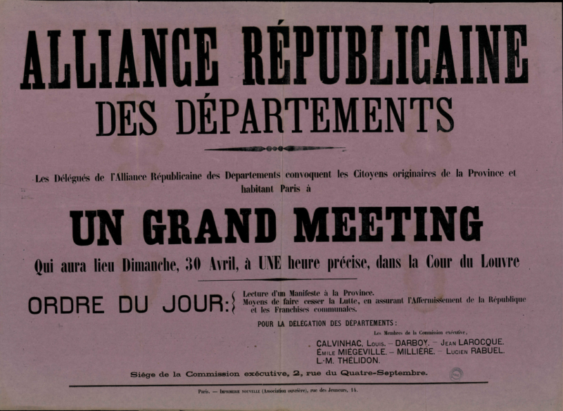 Pour aujourd’hui, je vais parler de la réception de l’Alliance républicaine des départements, qui touche le sujet crucial de l’isolement de la Commune. J’utilise le compte rendu qui est dans le recueil des procès verbaux (les pages du 30 avril sont en ligne, là).