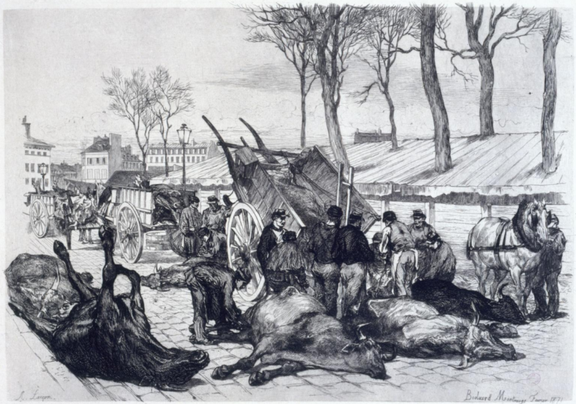 N’empêche, on peut maintenant manger du bœuf à Paris, comme le montre l’estampe d’Auguste Lançon, boulevard Montrouge (aujourd’hui Edgar Quinet, qui sera d’ailleurs un des élus) en février 1871, que j’ai utilisée comme couverture après l’avoir trouvée au musée Carnavalet.