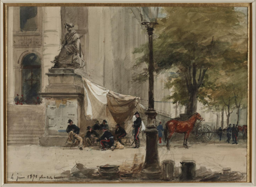 L’illustration de couverture est due à Isidore Pils, je l’ai choisie parce qu’elle est datée du 4 juin, elle est au musée Carnavalet. Ce sont des artilleurs versaillais au repos, le titre est Campement d’artillerie place de la Bourse. Si je reconnais le monument, les escaliers et la statue, j’ai un peu de mal avec l’absence de grilles. Oui, ces grilles sont attestées à l’époque: le journal Le Français, par exemple, écrivait, le 27 mai:
