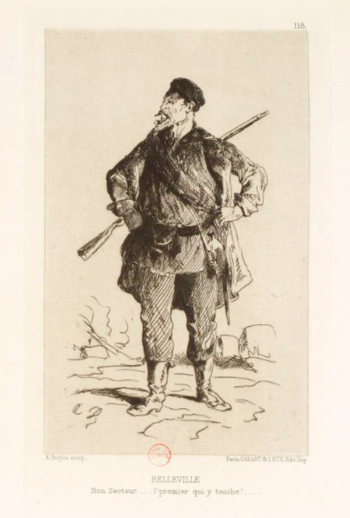 Sur l’image de couverture, « Belleville », le garde dit: « Mon secteur!… L’premier qui y touche! » Je l’ai trouvée sur Gallica, là.