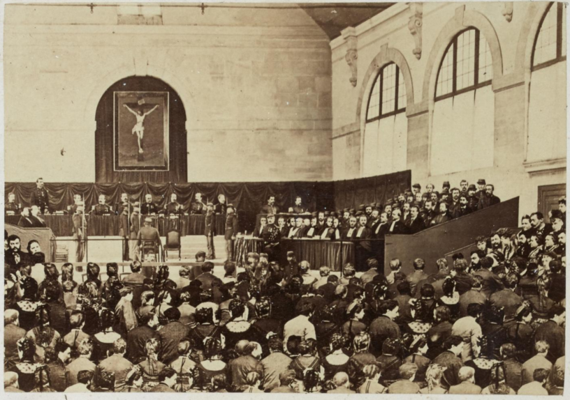 La « photographie » que j’ai utilisée en couverture de cet article vient du musée Carnavalet. Le grand nombre de femmes présentes m’a étonnée. Celles-là ne sont certainement pas « du parti de ces messieurs », d’ailleurs elles sont devant. Elles appartiennent — je cite encore Lissagaray — aux bourgeois de marque, aux familles honnêtes, à l’aristocratie de la prostitution, à la presse aboyante. Ces journalistes jacasseurs, ces toilettes tapageuses, ces visages souriants, ces jeux d’éventail, ces bouquets radieux, ces lorgnettes braquées dans toutes les directions, rappelaient les premières les plus élégantes.