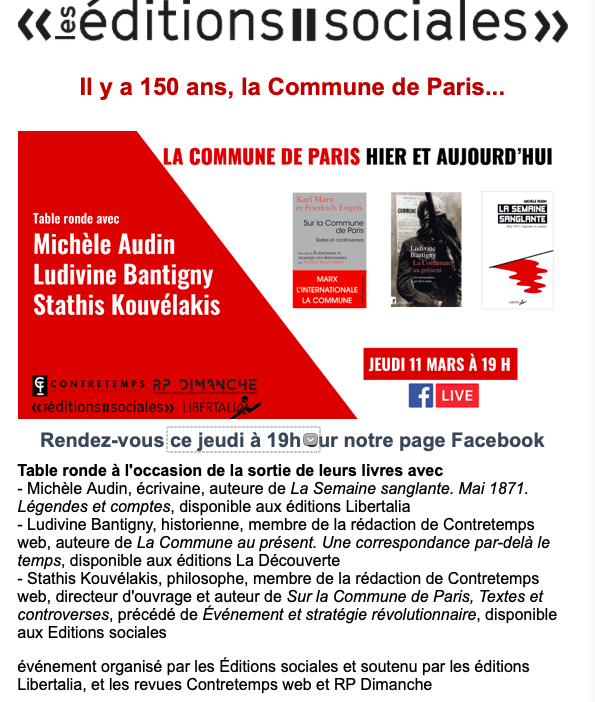 Un débat. Le débat est une « table ronde », il se tient jeudi 11 mars à 19 heures… à distance, et vous pouvez y assister… de même, en vous rendant sur la page facebook des éditions sociales (mais il n’est pas nécessaire d’avoir un compte facebook — je n’en ai pas). Il est animé par Marina Simonin, des éditions sociales, et nous y participons, Ludivine Bantigny, Stathis Kouvélakis et moi, à propos de nos livres, que j’ai déjà mentionnés rapidement ici ou là (et dont les références figurent au pied de cet article.