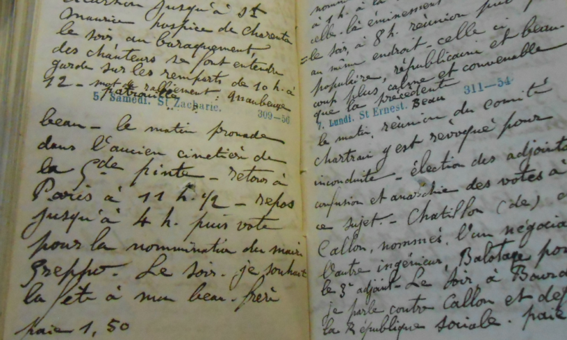 Lundi 7. Beau. le matin, réunion du comité. Chartrain y est révoqué pour inconduite. élection des adjoints, confusion et anarchie des votes à ce sujet. Chatillon (de) et Callon, nommés. l’un négociant, l’autre ingénieur. Balotage [sic] pour le 3e adjoint. Le soir à Bourdon je parle contre Callon et définit [sic] la République sociale. paie 3.