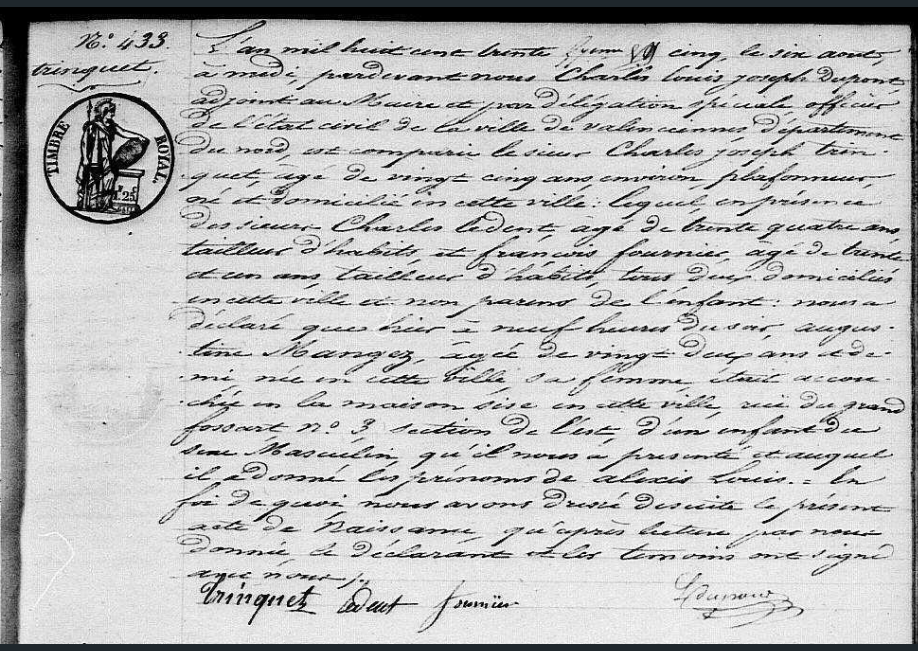 De son acte de naissance, nous apprenons que son père était plafonneur et qu’il avait « environ 25 ans », ce qui laisse sous-entendre qu’il ne connaissait pas sa date de naissance — en tout cas, il savait signer son nom. Il avait donc « environ » 29 ans quand il est mort, le 23 mars 1839, toujours à Valenciennes.