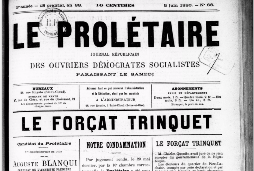 L’image de couverture est la une de l’hebdomadaire Le Prolétaire, daté du 5 juin 1880. Ce journal n’est malheureusement pas sur Gallica. On y voit, sous la manchette, de gauche à droite, une candidature de Blanqui à une élection législative dans le département du Rhône, une condamnation du journal (se concluant par « tout commentaire serait superflu »), et l’annonce de la candidature du « forçat Trinquet » au siège libéré par Charles Quentin.
