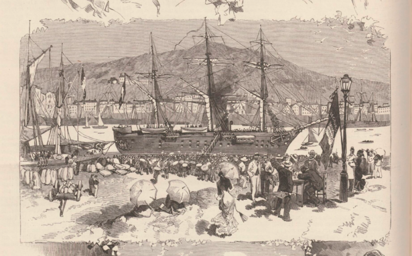 Quant à l’image de couverture… ce n’est pas le Navarin mais le Var, ce n’est pas à Brest mais à Port-Vendres (voyez les montagnes), ce n’est pas en janvier mais en août ou septembre (voyez les ombrelles) et d’ailleurs ce n’est pas en 1881 mais en 1879… ce n’était pas une amnistie plénière mais une grâce amnistiante, mais ce sont des amnistiés qui arrivent de Nouvelle-Calédonie et c’est la seule image que j’ai trouvée, dans Le Monde illustré, le 13 septembre 1879.
