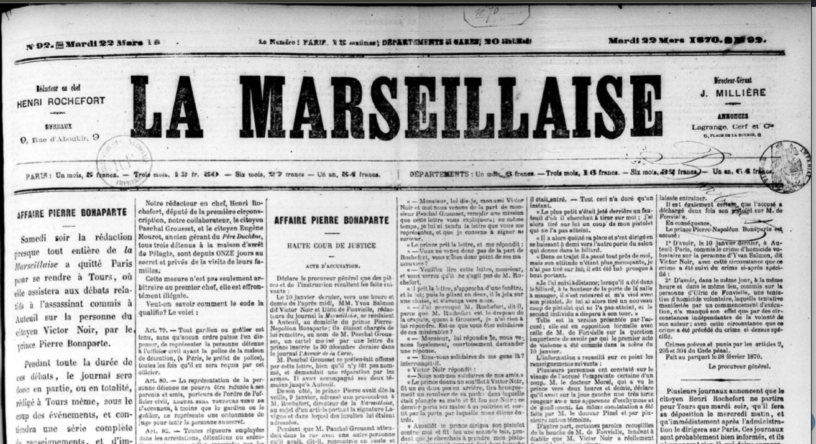 Voici quelques petites nouvelles de la famille. Dans les listes de souscription pour l’érection d’un monument à la mémoire de Victor Noir, La Marseillaise publie, dans son numéro daté du 30 janvier, une « citoyenne Trinquet », qui donne 25 centimes, suivie par « le citoyen Trinquet fils, républicain de 12 ans qui refusera l’impôt du sang » (c’est-à-dire la conscription), qui donne aussi 25 centimes… et je ne suis pas seule à relever cette mention, qui fait hurler Le Figaro « Pas bête, le jeune citoyen Trinquet ! »