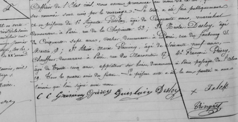 Sur l’image de couverture, la signature d’Alexis Trinquet au bas de l’acte du dernier mariage célébré par la Commune dans le vingtième arrondissement, c’était le samedi 20 mai à 11 heures du matin, un chauffeur de 71 ans épousait une journalière de 34 ans. L’acte a été bâtonné (voir cet article en cas de besoin). L’image vient bien sûr des archives de Paris.