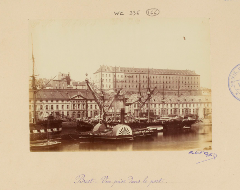 La photographie de Brest vue du port a été prise par Hubert Vaffier, qui l’a donnée à la Bibliothèque nationale en 1891. Je l’ai trouvée sur Gallica, là.