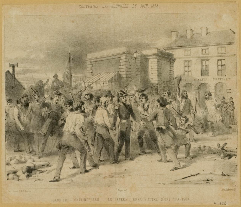 Je ne résiste pas à mettre encore ici une image de 1848, qui « raconte » l’histoire du Général Bréa. Elle a dû paraître dans un journal mais je l’ai trouvée au musée Carnavalet.