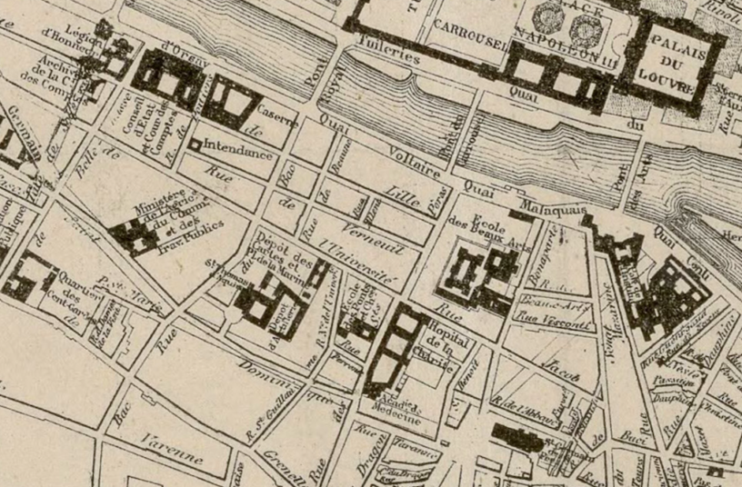 C’est alors que les Insurgés mirent le feu à la Légion d’honneur, au Conseil d’État rue de Lille, etc. [Regardez le plan en couverture : notre beau réac est aux premières loges.]