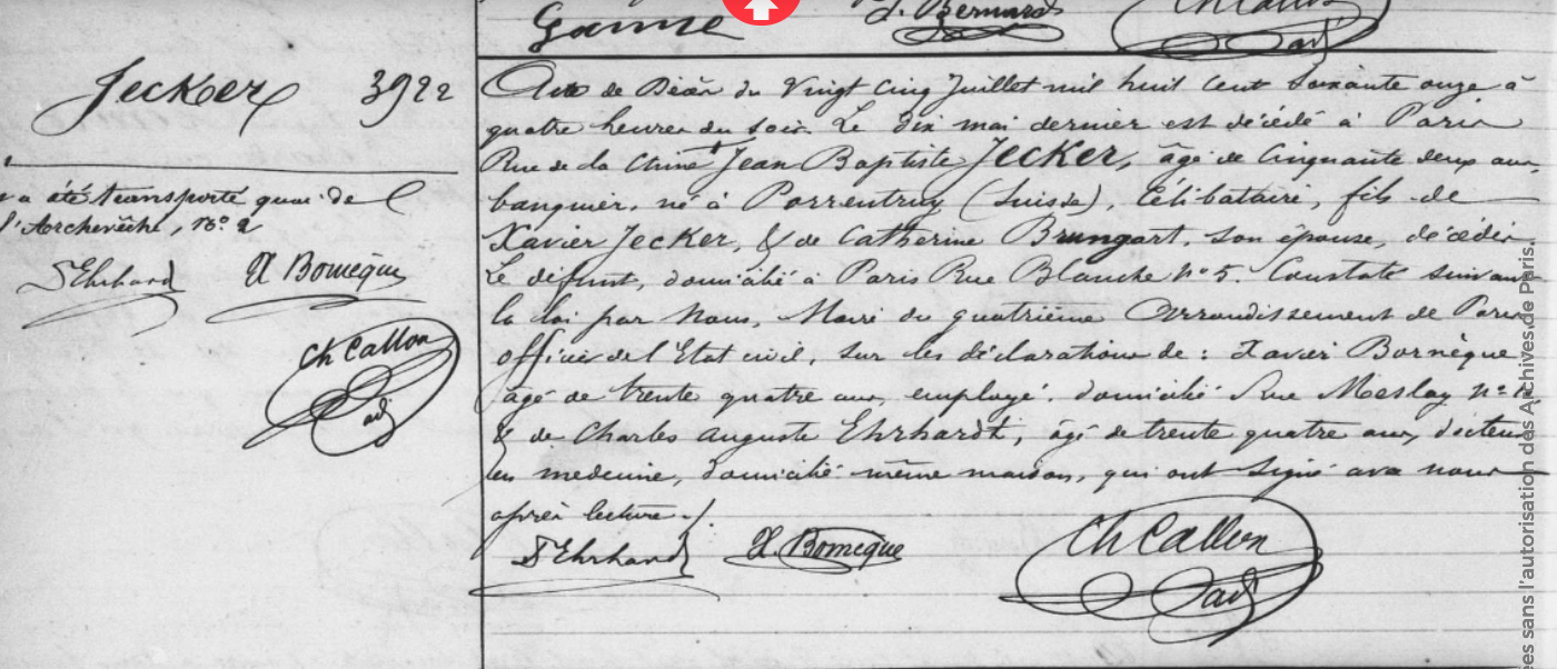 En tout cas, il portait tout ça et son linge était marqué, de sorte qu’un employé nommé Bornègue le reconnaît le 25 juillet, on rend le corps, il y a peut-être quand même quelqu’un de la famille, je lis une signature « Elsesser Jecker » sur un des documents, bref on enterre Jecker.