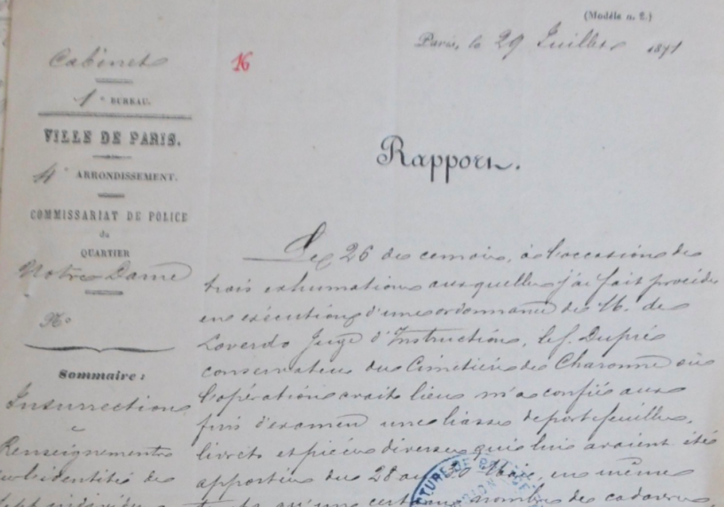 Si le nom du cimetière dont il est issu n’apparaît pas sur les documents policiers concernant le corps de Jecker, un rapport suivant du commissaire Lechartier (celui dont une partie fait la couverture de cet article) parle bien de trois corps exhumés au cimetière de Charonne.