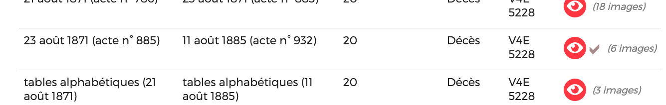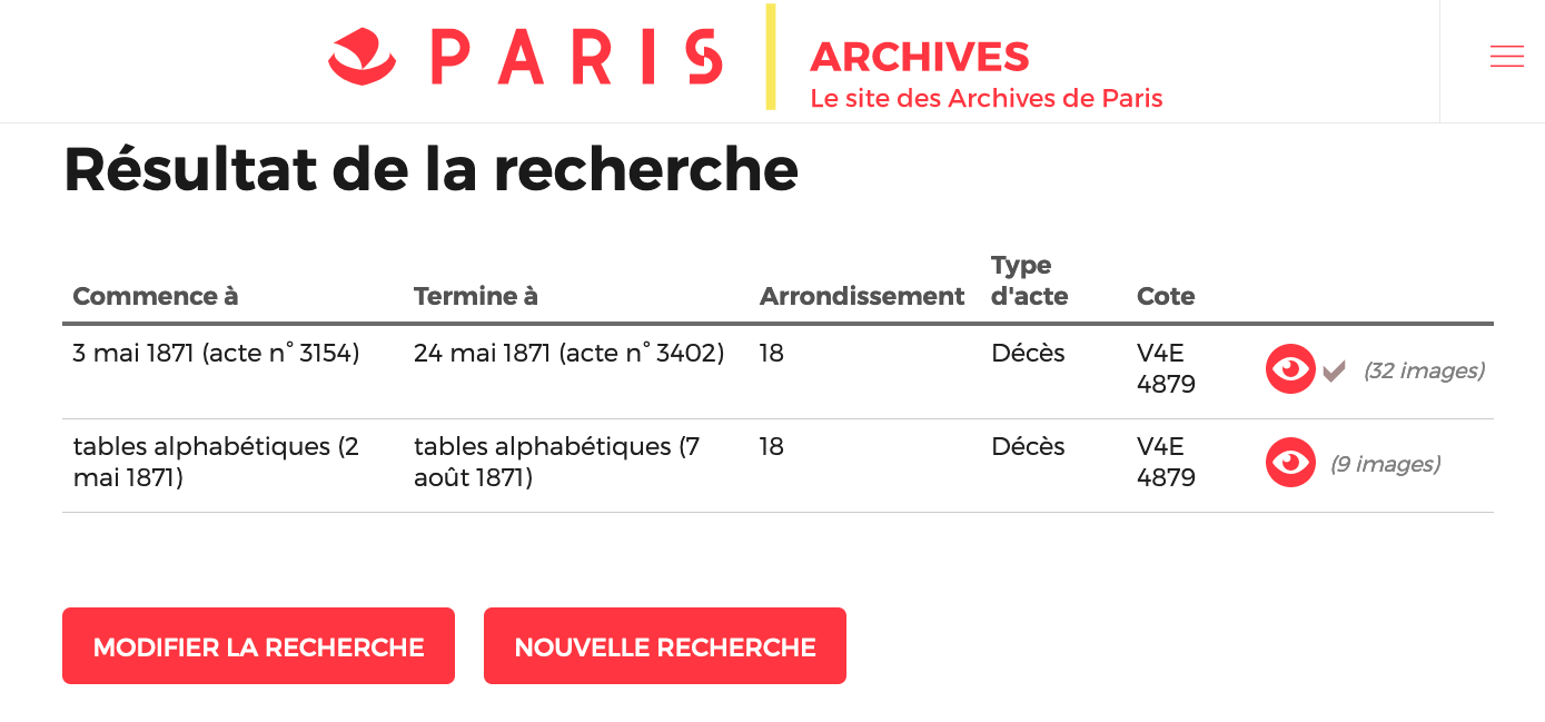 La liste du 20e arrondissement, voici comment la trouver: on demande les décès du 20e arrondissement en 1871, on regarde attentivement les réponses, et celle-ci