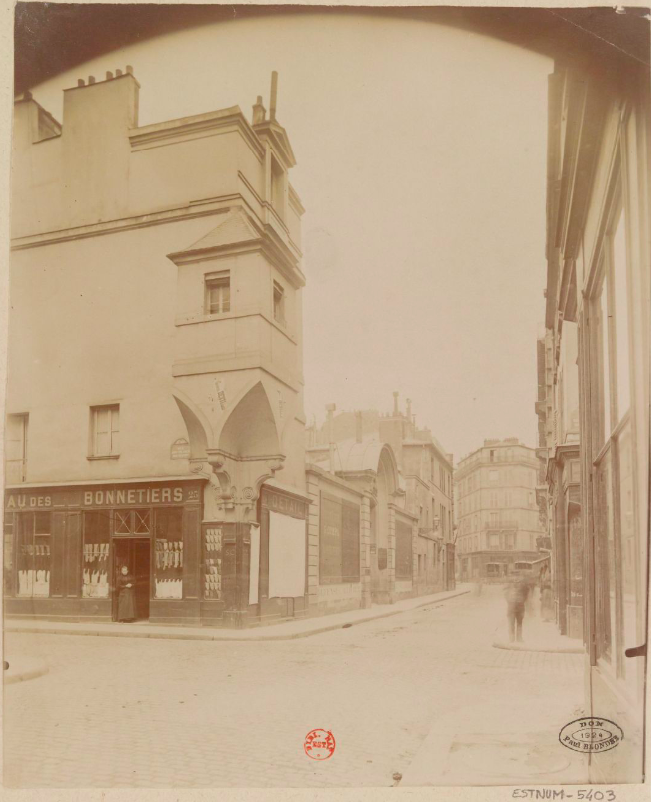 Sur la couverture de cet article, la bonnetière à sa porte regarde le photographe, Eugène Atget, qui photographie la rue Pavée et l’entrée de l’Hôtel de Lamoignon… où n’est pas encore installée la Bibliothèque historique de la ville de Paris (mais ça viendra). Et la photo est sur Gallica.
