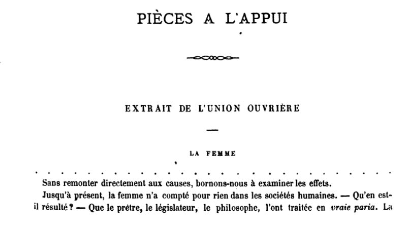 […] abordant la question sociale de la femme, dit que les philosophes anciens ont accusé la femme d’une infériorité morale; que longtemps la femme a été considérée pour zéro dans la société; il lit à l’appui de cette triste assertion divers passages de l’Union ouvrière, de Mme Flora Tristan (qui seront annexés au procès verbal).