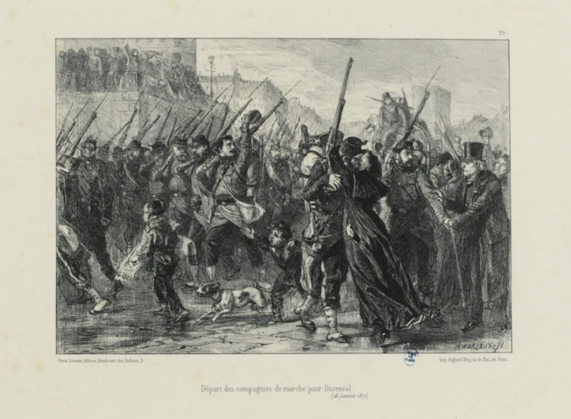 Demain, pendant que nous irons à Versailles, se préparera la dernière bataille. En couverture, les compagnies de marche de la garde nationale partent déjà pour Buzenval — voir notre article d’après-demain. Le dessin est dû à Clément-Auguste Andrieux et il est au musée Carnavalet.