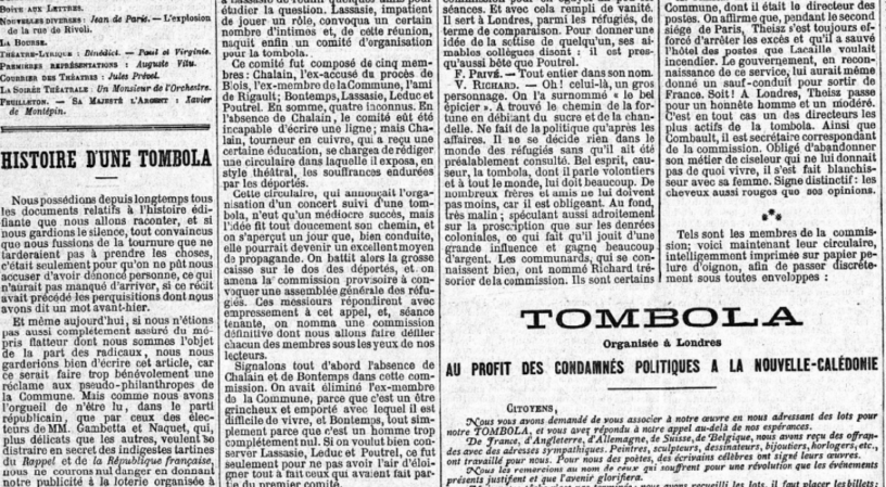 C’est l’histoire d’un journaliste du Figaro, à qui la préfecture de police fait un beau cadeau, à moins que M. Lombard se fasse payer, lui aussi, en tout cas ce journaliste fabrique, le 18 octobre 1877, une superbe première page de son journal, dans laquelle il raconte avec beaucoup de détails la préparation, depuis Londres, d’une tombola en faveur des déportés de Nouvelle-Calédonie et de leurs familles, ce qui met la proscription communarde londonienne, qui a pourtant déjà identifié quelques mouchards, en émoi, seul l’un d’entre eux a pu fournir ces informations…
