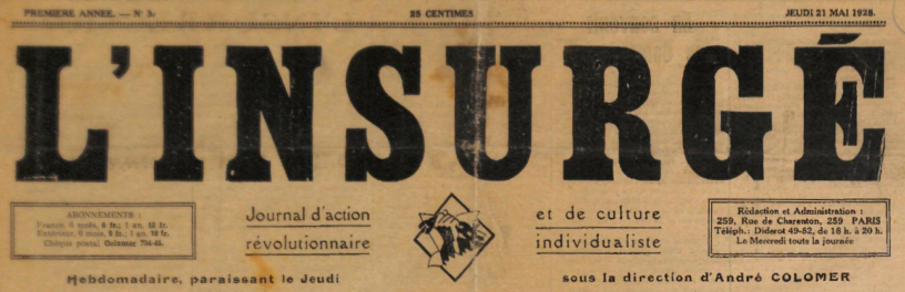Je donne la parole à André Colomer (1886-1931), écrivain et directeur de ce « Journal d’action révolutionnaire et de culture individualiste ». Voici son article. Je n’ajoute aucun commentaire, ni sur la rhétorique, ni sur le style.