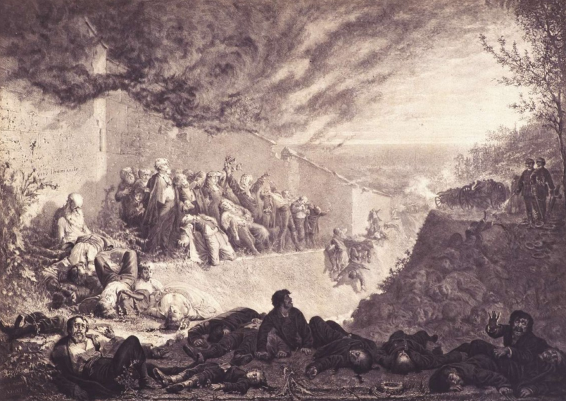 Au fond, une muraille. Devant elle, acculé dans un coin, un groupe nombreux de femmes, d’hommes et d’enfants. À leurs pieds, une fosse profonde. Au premier plan, des cadavres, en particulier d’enfants, et des agonisants. Parmi eux, un homme vivant, qui regarde. C’est une batterie de canons qui va faucher ces nouvelles victimes. Au-dessus de cette scène, un ciel d’apocalypse. Fumée d’un incendie derrière le mur? Nuages?