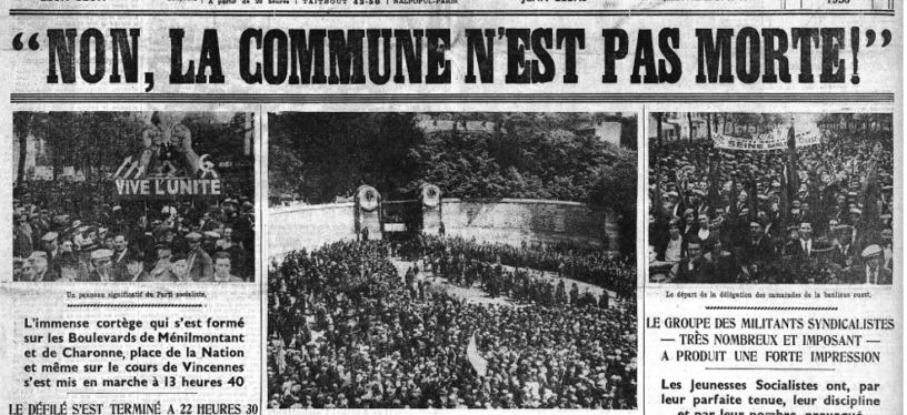 Quelle journée ! Ce soleil tiède et clair, cette odeur de bouquets, le frisson des drapeaux! Ces flambées d’espoir, ce parfum d’honneur. J’ai lu les journaux. L’Humanité et Le Populaire rendaient hommage aux trente mille fusillés de la Semaine sanglante – après tout, c’est pour ça qu’on manifestait au Père-Lachaise. Avec des titres adaptés, comme