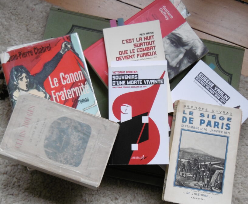 À ces dates, en tout cas celles du printemps 2020, mais aussi, dans une mesure à peine moindre, celles de l’été, je n’ai eu accès qu’à de la documentation en ligne (principalement sur Gallica, aux Archives de Paris, sur le Maitron, dans Paris Musées pour les images…), aux livres que je possède (dont quelques-uns figurent sur la photographie ci-dessus et dans la liste ci-dessous) et aux réponses d’amis historiens aux questions que je leur ai posées.